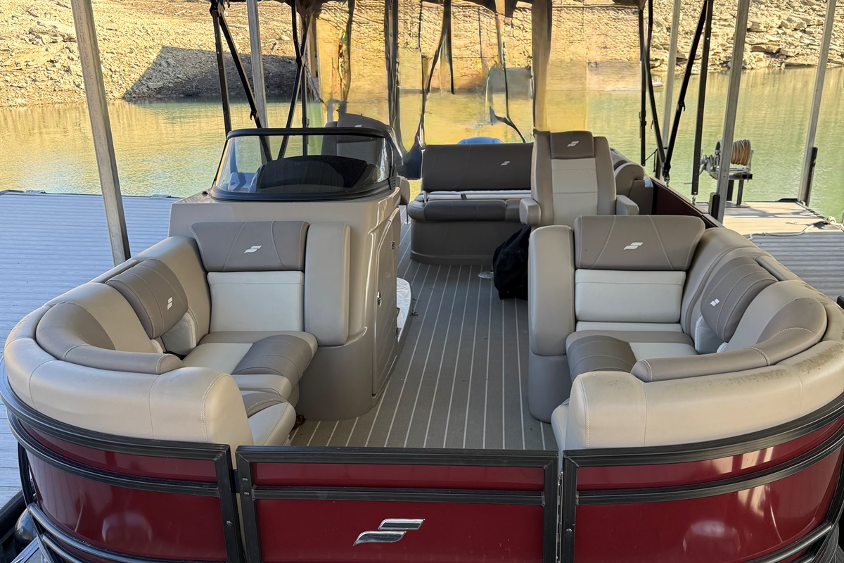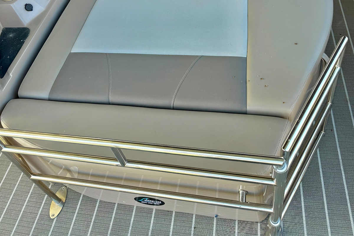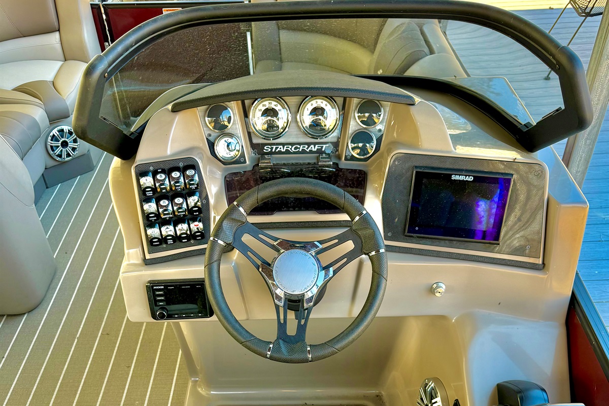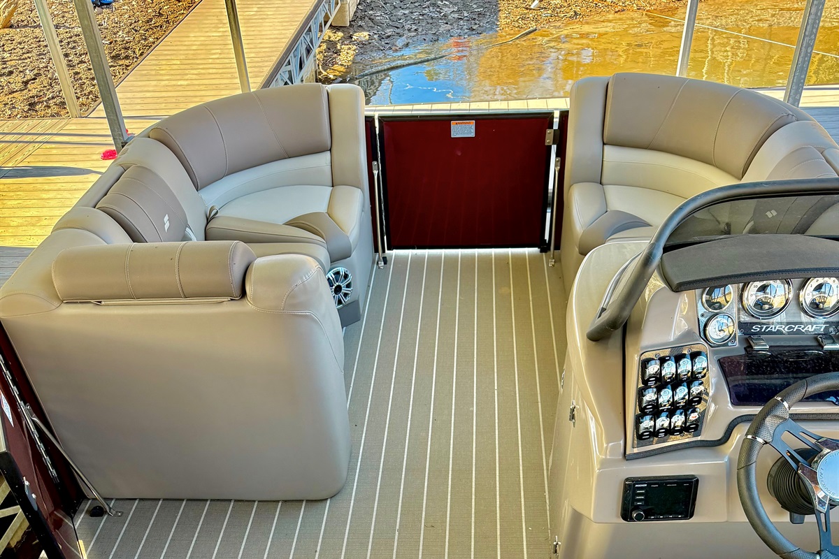 The StarCraft Tritoon boat sits 12 people and is a luxurious and stylish option for a day out on the water. With a powerful 250HP engine and a unique fold-down bar, this boat is perfect for entertaining and relaxing. The rear-facing lounge allows multiple people to lay out and soak up the sun, while the adjustable and swivel bar stools provide a comfortable spot to enjoy a cold drink. The extra large Bimini top offers plenty of shade, or can be used as a dry cover in the rain. The boat is equipped with a Bluetooth-enabled JL audio stereo system with controllers at the helm and at the bar, as well as a Waterway GPS system and depth finder. There's even light-up cup holders and speakers for added convenience. The adjustable reclining captain's chair and middle section lounge area with a removable table provide ample seating and space for all your guests. The boat also comes with an anchor and 100' of rope, as well as a telescoping swim ladder and 12 life jackets for safety. Overall, the StarCraft Tritoon boat is the perfect choice for a day of fun on the water.